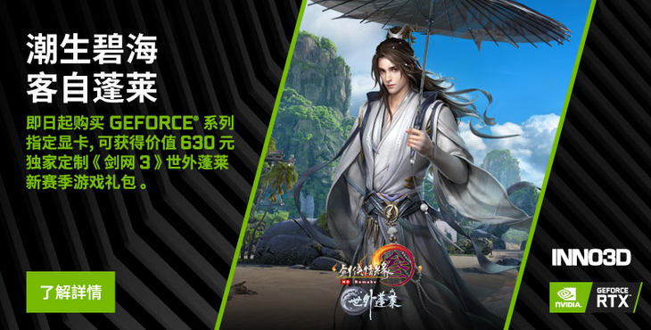 2018年12月17日至2019年1月17日活动期间,购买映众(INNO3D)GEFORCE GTX 1060 6G, GEFORCE RTX 2070/2080/2080Ti显卡(任选其一),均可以参加活动,用户在购买指定显卡后,可以登陆以下链接提交购买信息与序列号,在验证后将获得兑换码,然后凭兑换码则可以到英伟达指定网站兑换价值630RMB的《剑网3》专属游戏礼包,包含:120元畅玩卡,永久蓬莱主题海獭背挂,以及90天海獭跟宠和新手礼包。