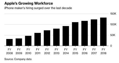 过去10年,苹果一直在招兵买马,但是员工数量增长速度已在近几年放缓。最近一个财年,苹果增加了大约9000名员工,员工总量达到13.2万人。一年前,苹果增加了大约7000名员工。