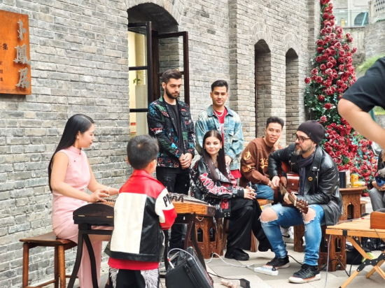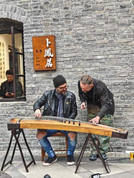 活动现场气氛热烈,参与者们热情高涨。在开场活动中,由来自俄罗斯的外籍模特身着中国传统旗袍进行时尚走秀,让现场观众们一饱眼福。接着,西洋乐器贝斯与中国传统乐器古筝合奏,奏响了游客的参与热情,随着一曲古筝伴奏的英文歌曲在公馆上空回旋,活动现场的游客纷纷拍照打卡留念。据了解,本次活动邀请到来自乌克兰的歌手、英国的吉他手、美国的键盘手和中国的古筝手,他们在活动现场即兴演奏,分享对音乐的热爱,为现场游客带来了一场视听盛宴。