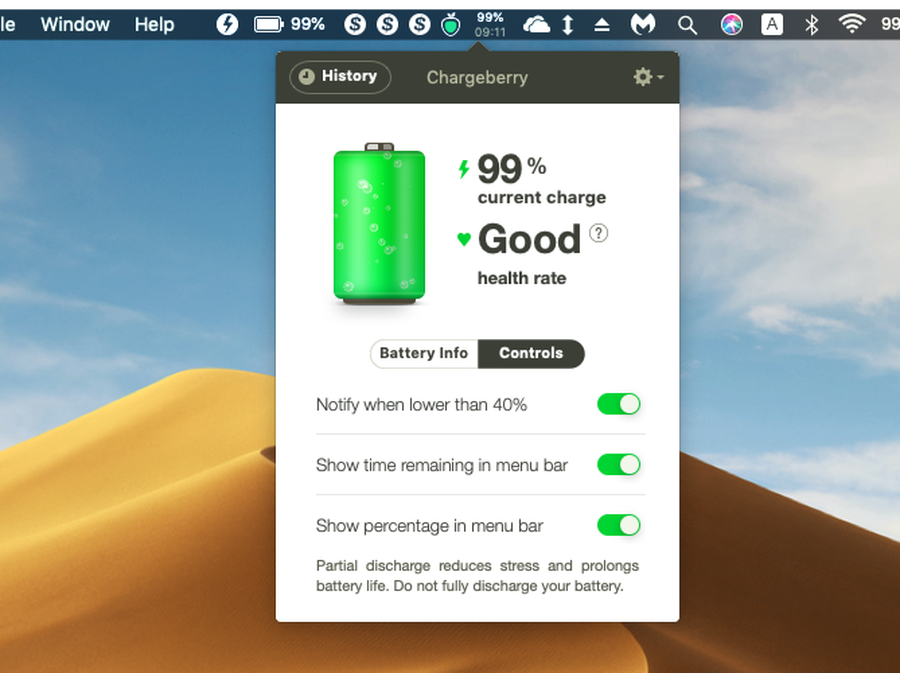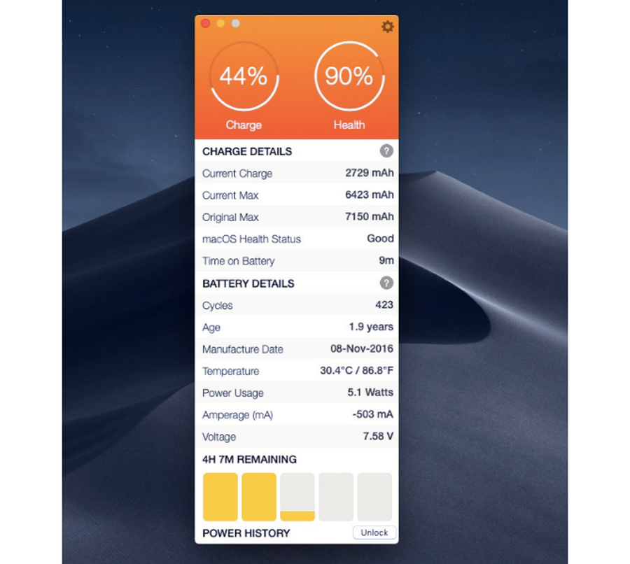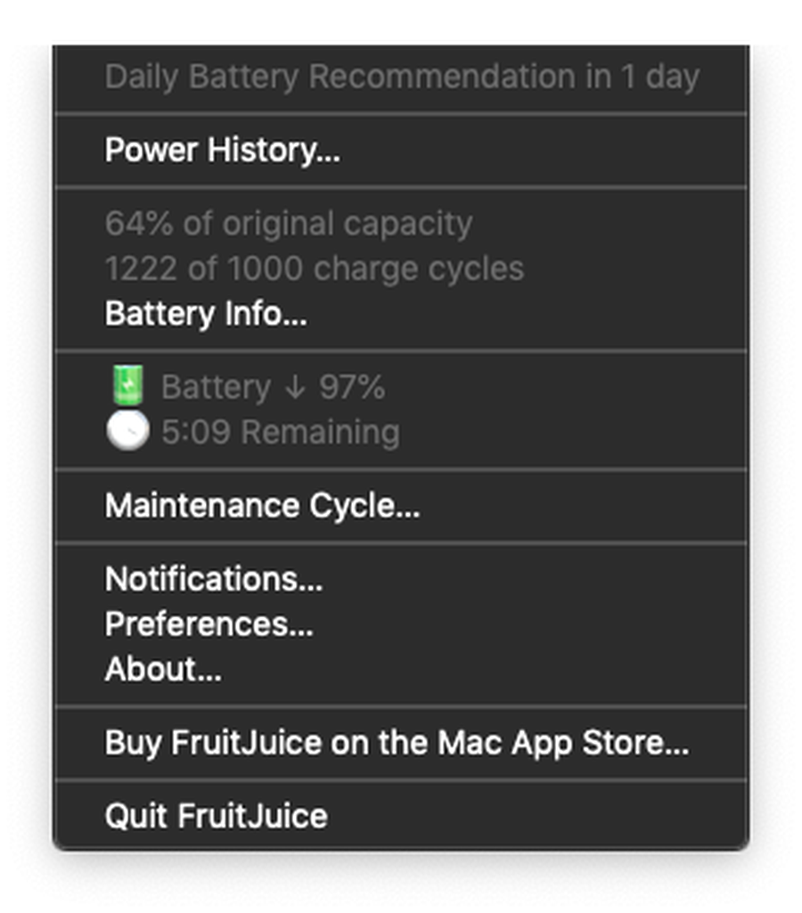 与Chargeberry一样,FruitJuice最重要的功能是电池监控和维护。该应用会在第一次启动时运行维护周期模式,该模式使放电保持在100%至20%的最佳范围内。该应用有电源历史记录功能,可将高达一年的电池统计信息绘制成图。