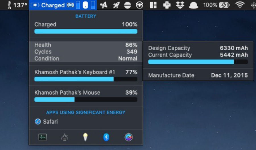 iStat菜单可以直观的看到风扇速度,内存消耗和网络指示等数据,但最重要的是iStat有一个非常好用的电池监控功能,该功能可以显示电池运行状况,运行周期和电量大小,只要将鼠标悬停在选项栏上就可以看到电池的内容信息。