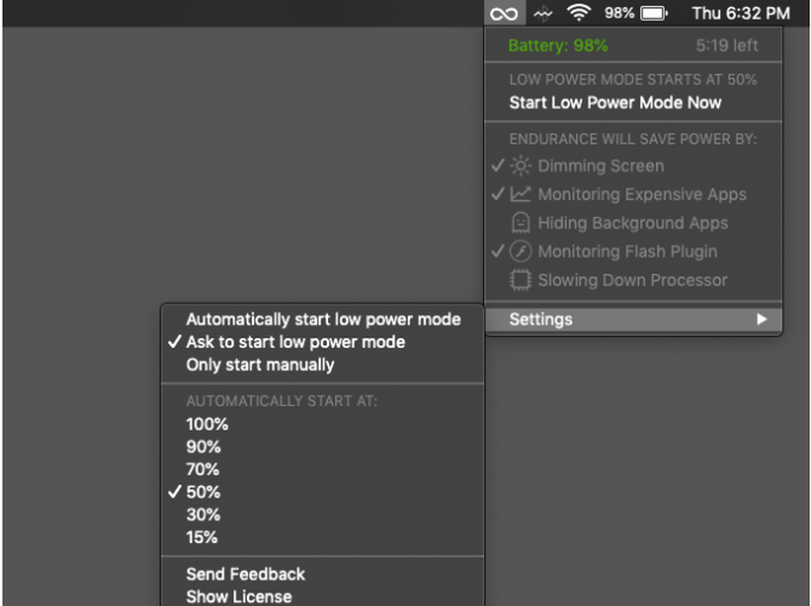 耐力电池是一个活跃的电池管理工具,能够帮助Mac用户延长电池寿命。一旦电池电量低于设定的百分比,它就会将Mac切换到低功耗模式。该工具通过调暗屏幕,监控应用程序,监控Flash插件,停止处理器线程和关闭后台应用程序来节省电量。