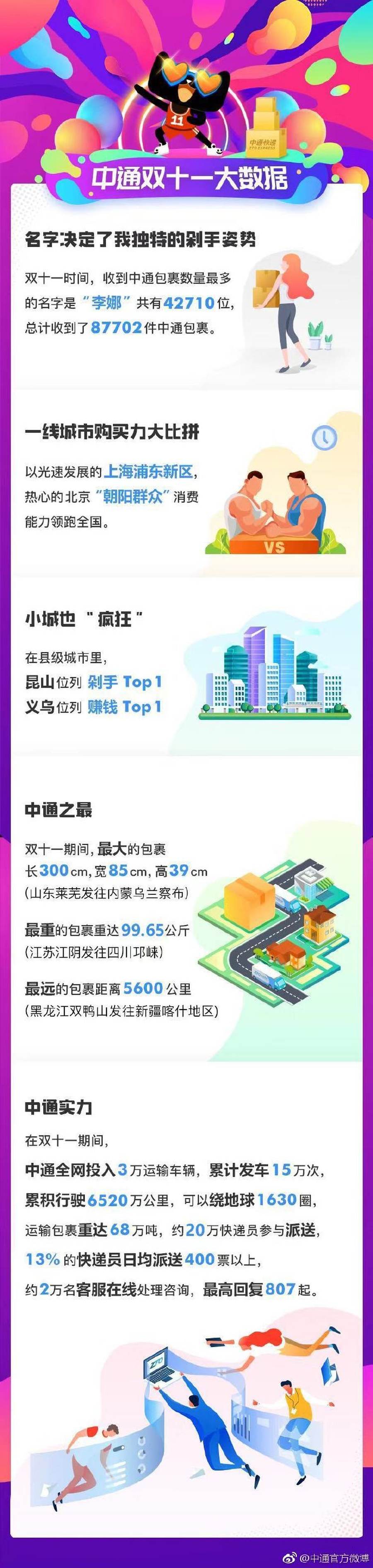 数据显示,双十一期间,收到中通包裹数量最多的名字是“李娜”,共有42710位,总计收到了87702件中通包裹。