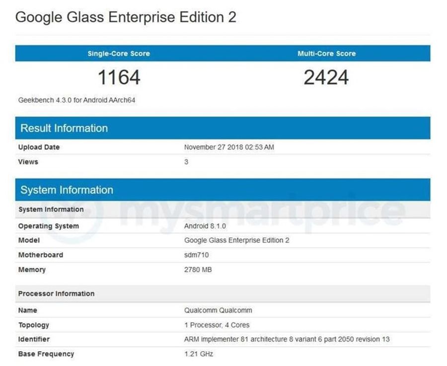 最近,一款名为“Google Glass Enterprise Edition 2(简称“GG2”)”的型号获得了FCC(联邦通信委员会)的认证,虽然它不太可能在2018年上架,但它已经出现在了跑分网站上。
