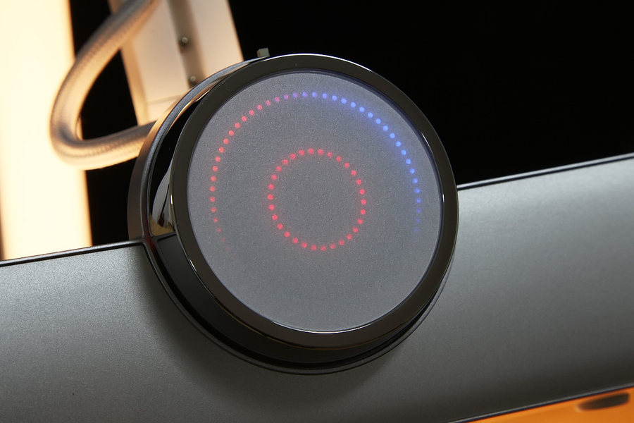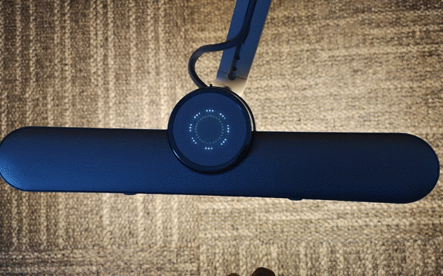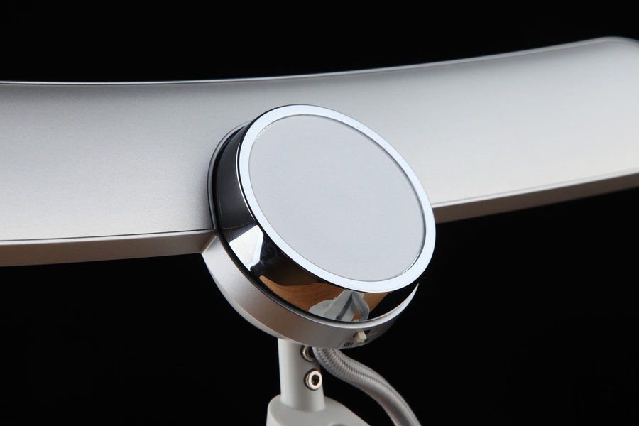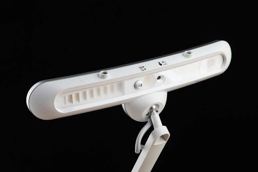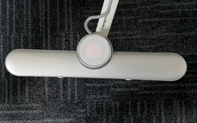 在灯头上,有一个圆形的旋钮,可以用来控制灯光的亮度及色温。旋钮最内侧的圆形色环代表了桌面的亮度,为绿色时则表示亮度刚好,红色则是过暗,蓝色则为过亮,这样我们就可以通过色环的颜色直观的了解到当前的灯光的亮度情况。