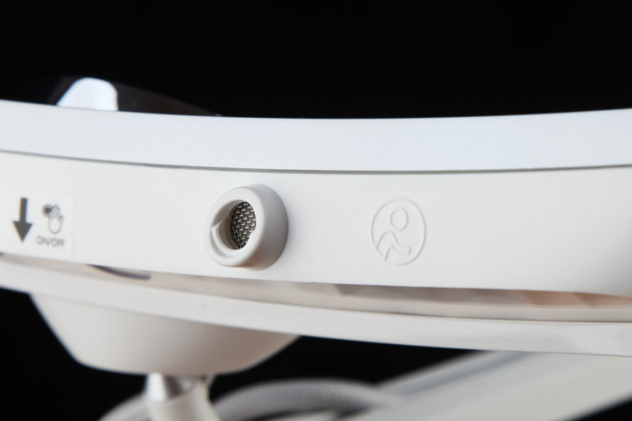 灯头正面两个突起的部分,即为超声波侦测感应器模块,用来结合红外线侦测感应器判断孩子的坐姿状态,当坐姿不适时,台灯会智能的通过语音提醒孩子,像是时刻都有一名看不见的老师,在纠正着孩子的坐姿。