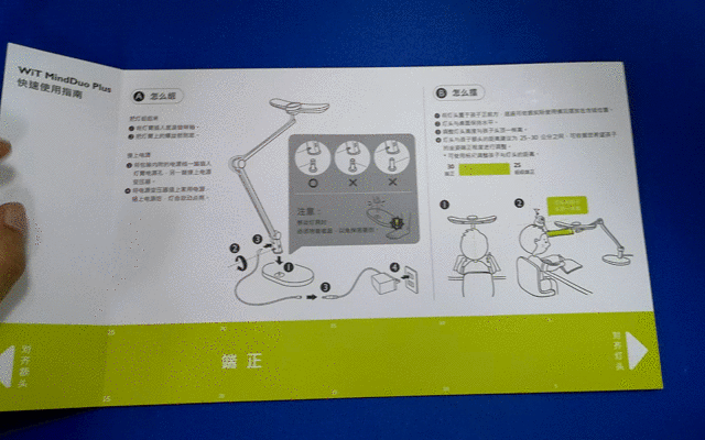 作为一款可以矫正坐姿的台灯,其摆放也需要遵循相应的规则。我们要将灯头置于孩子的正前方,在与桌面保持水平的同时,也要与孩子的头顶保持同高。灯头与孩子额头的距离建议保持在25~30cm之间。明基还贴心的在台灯的快速使用指南中加入了距离标尺,方便家长对于台灯的调节。