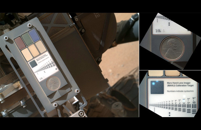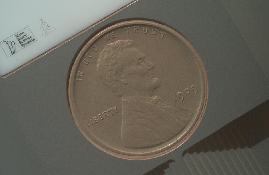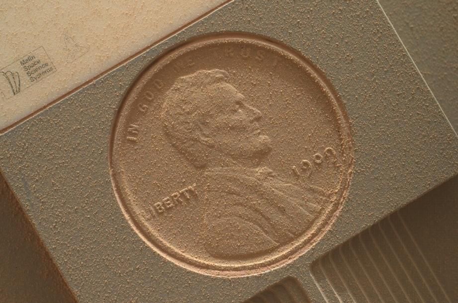 地理学家们在拍照时通常会在目标旁边放一个硬币,以作为校准器来保证照片的比例精准,虽然好奇号上有其它更为复杂精致的校准器,但NASA还是决定把这枚1美分硬币放到火星车上,以示对传统科学的尊重。这枚硬币是由机械臂上手持透镜成像仪的工程师肯恩·埃迪特捐赠的,据说按照总价25亿美元的好奇号上各个设备的作用,它的价值高达7000万美元——谁要是去把它拿回来就发(po)财(chan)了。