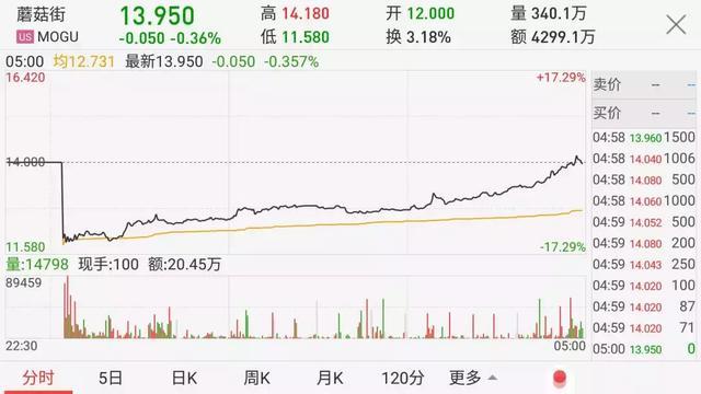 上市首日,蘑菇街开盘价为12.25美元,相较14美元的发行价下跌12.5%。经过一天的震荡上升后,蘑菇街股价一度超过14美元发行价,可惜收盘时,停在13.95美元。