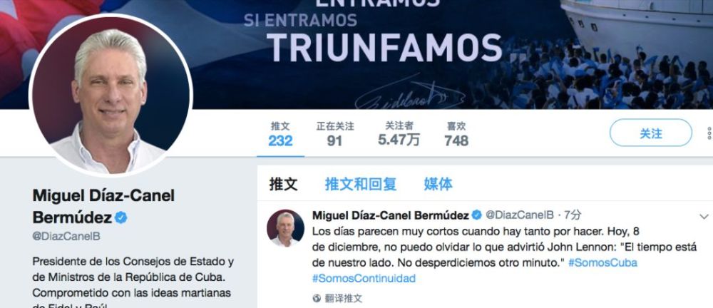 要知道,古巴国务委员会主席兼部长会议主席米格尔·迪亚斯-卡内尔·贝穆德斯也是一位“推特控”,他不仅有自己的社交媒体账号,而且每天都要发好几条推文。