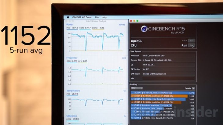开始先使用Cinebench R15对原装的i7处理器的Mac mini进行压力测试,只用了很短的时间Mac mini的CPU达到了100摄氏度。这就是英特尔CPU温度的极值了,当温度稳定后,CPU核心频率保持在3.4GHz和3.5GHz之间。在进行多次测试之后,原厂散热下的Mac mini取得了1140分的平均成绩。