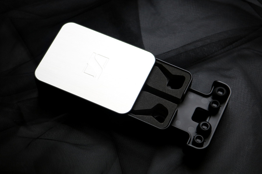 打开包装之后,IE60的便携式收纳盒着实让我惊讶。金属质感的收纳盒正面采用了拉丝工艺,对于整体质感有较大提升。除了正面的中央位置为森海塞尔的产品Logo之外,在盒子的侧面也粘贴了森海塞尔的英文品牌名及Logo,整体看起来现代感十足。